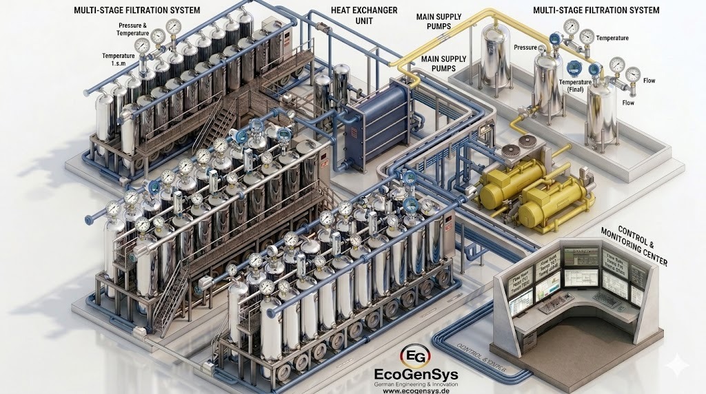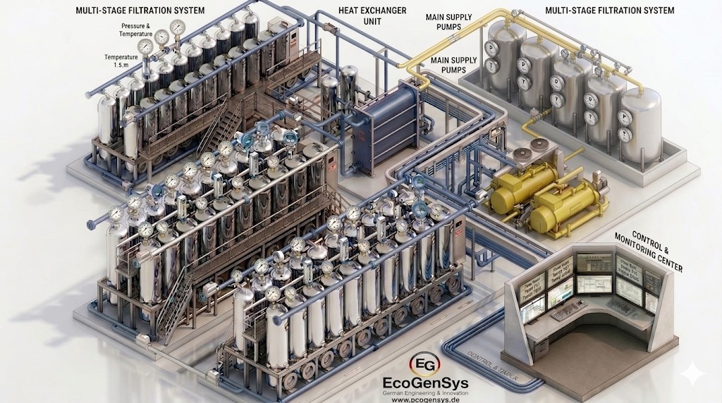 This is a compact industrial filtration unit built around a filter press system, designed to separate solids from liquids in a controlled, high-pressure process. The system pumps a slurry into a series of tightly packed filter plates that create chambers; as pressure is applied, the liquid passes through filter media and is collected as clean filtrate, while solid particles are retained and compressed into a dense “filter cake.” The unit includes supporting components such as pumps, valves, piping, and a control panel to regulate flow, pressure, and automated cycles like filling, pressing, and discharge. Its compact, skid-mounted design makes it suitable for industrial applications such as wastewater treatment, chemical processing, and material recovery, where efficient and repeatable solid-liquid separation is required.